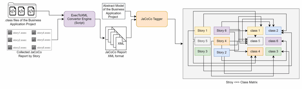 After collecting coverage data, it is converted to XML and analyzed to construct a bidirectional story ↔ class matrix. This matrix maps each story to the classes it affects and is version-aware, reflecting the state of the application at the time the feature branch is created. Serving as the primary reference for both test selection and coverage monitoring, the matrix enables precise identification of which parts of the application are exercised by each story. Figure 4 illustrate the sub-process.