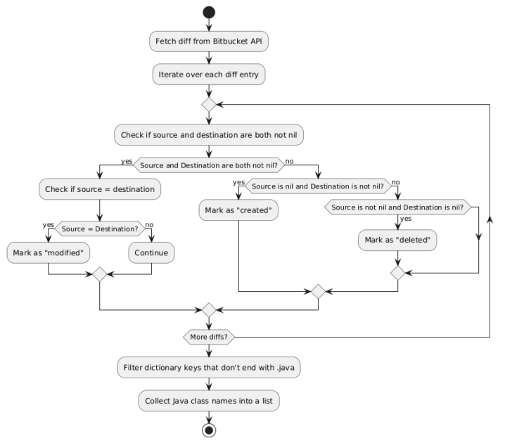 When a PR is submitted, we analyze its impact by extracting the list of created, modified, or deleted classes from the Bitbucket diff. This data is stored in a dictionary for fast lookup, allowing precise identification of which parts of the codebase are affected. A PR that modifies multiple classes can then be quickly matched against the story ↔ class matrix to determine which stories affect those classes, ensuring that only relevant tests are selected for execution.