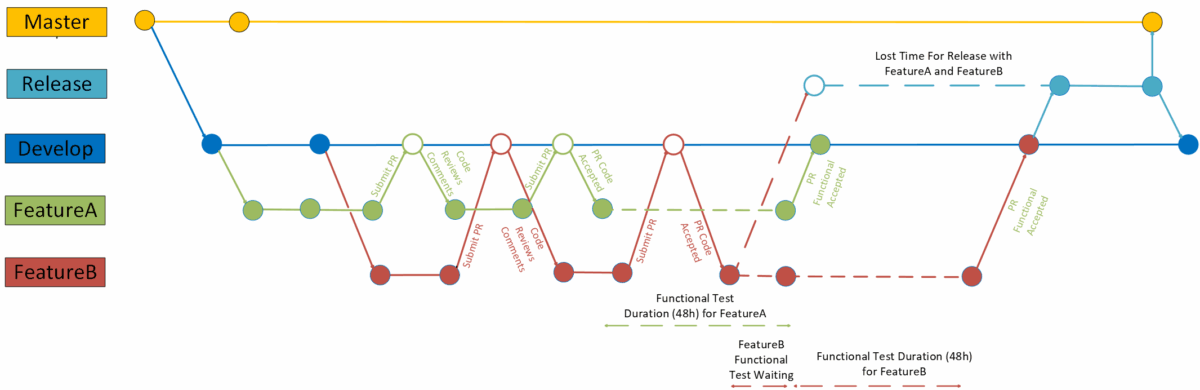 Long execution times become especially problematic during the PR workflow. With 20–30 PRs submitted daily, functional tests must run before merging, creating major bottlenecks, as illustrated in Figure 2. Even with partial parallelization, validation may take 8+ hours, consuming cloud resources and delaying developers and reviewers.