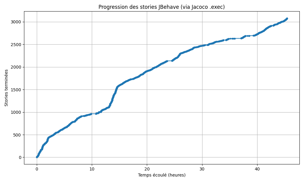Running more than 3,000 functional stories sequentially on a modern workstation takes 48 hours, as shown in Figure 1. Sometimes, tests might fail due to failed steps, and a single failed step often skips the rest of the scenario, leaving gaps in validation. Whithout parallelisations, merging PR takes time because one need to wait for test to run for every PR.