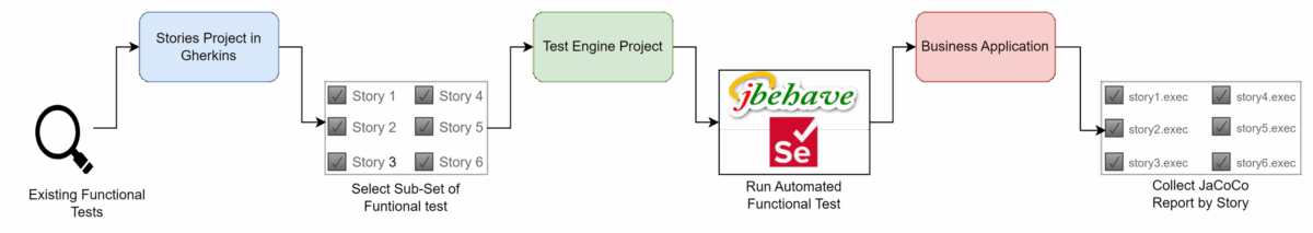 The first stage involves collecting detailed coverage data by executing functional test stories written in Gherkin syntax. These stories run sequentially via JBehave steps, which drive Selenium to interact with the application (Figure 3). To determine which classes are affected by each story, we use Jacoco in TCP mode. This configuration allows coverage counters to be initialized before the first story, updated continuously during execution, and exported into separate .execfiles after each run—functionality that the traditional Jacoco file mode cannot provide, as it only calculates coverage when the JVM process stops. Counters are reset between stories to ensure clean, precise per-story coverage, establishing a reliable foundation for the story-to-class mapping.