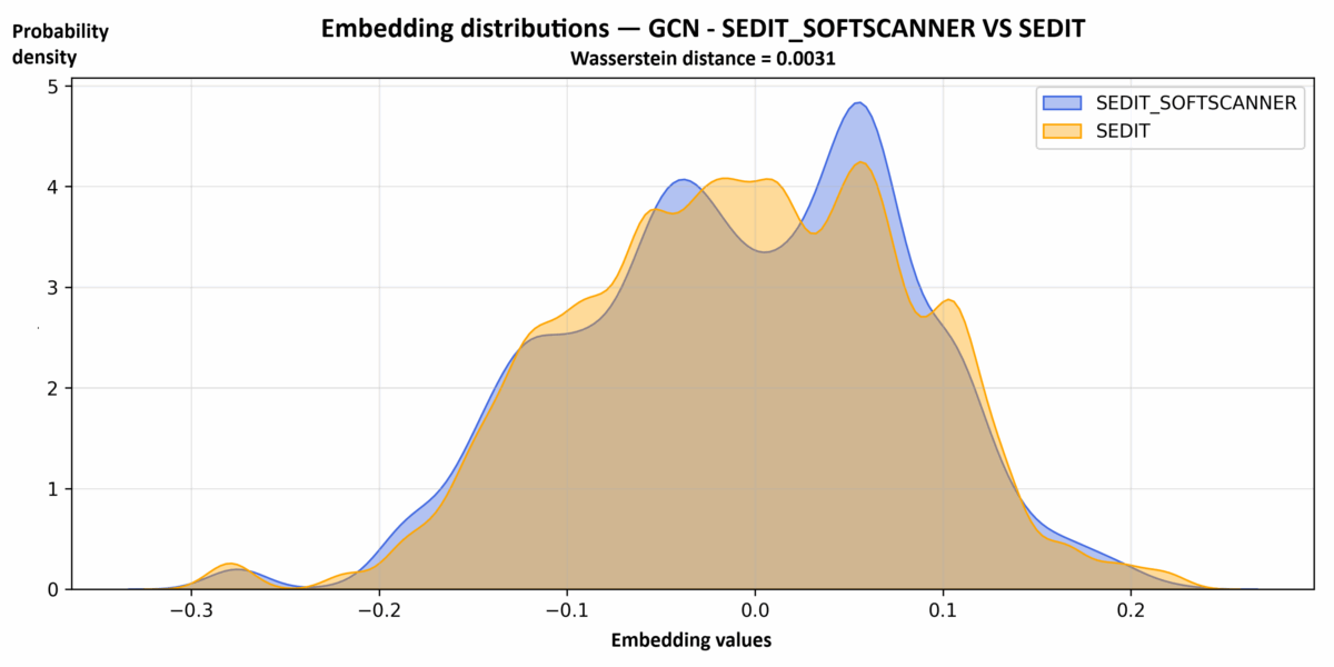 These graphs all tell the same story: the theoretical trajectories replayed in SEDIT SOFTSCANNER are far from being unrealistic. They inhabit the same latent space as the trajectories resulting from everyday use, whether from the point of view of local patterns (Pattern2Vec), the overall structure of sequences (SGT), or navigation topology (GCN).