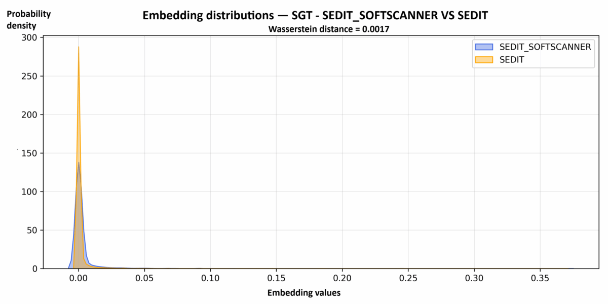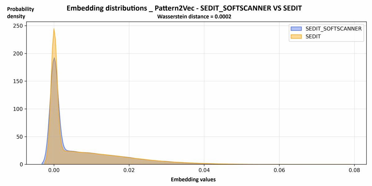 Figure 3: Pattern2Vec: the distributions of embeddings from the prescribed scenarios (in blue) and actual uses (in orange) overlap almost perfectly. The Wasserstein distance is extremely low (0.0002).